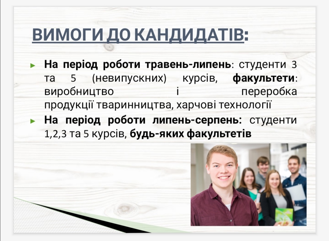 Виїзд 28.05.2023 (Студенти 3 та 5 невипускних курсів, факультетів : тваринництва, харчових технологій), період зайнятості 3 місяці